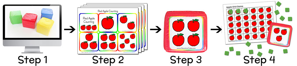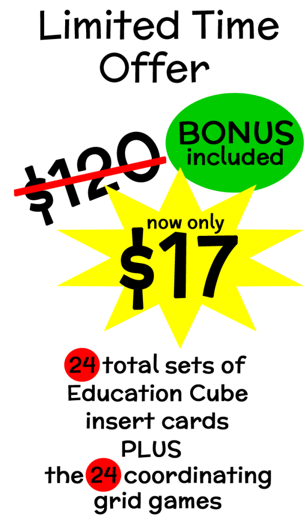 You’ll receive an email from me with links to download all 24 sets of Education Cube insert cards and all of the 24 coordinating grid games.